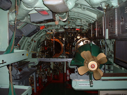After checking out the bridge of the Intrepid, we headed over to the Growler, a WWII era submarine that had been adapted to fire nuclear missles with the addition of a "bat cave" to the top of its hull(oddly enough, as I was typing this entry, Growler was mentioned on the History Channel. You'll have to search the site to find out the rest of the story). To take the tour we had to take "the test". "The test" consisted of walking through a mock-up of a submarine hatch. We wondered out loud how many tourists flunk "the test" every year, but forgot to ask anyone who might know. The tour of Growler was confined to one deck, but you definitely got the flavor of submarine life aboard a WWII vintage craft. The tour ended at the aft torpedo room. Yes, the submariners bunked with their torpedos.