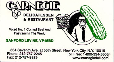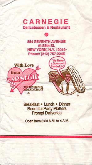 With our evening entertainment planned, we headed over to a pair of shoe stores on 14th Street to find some blister relief for my barking feet. After 15min. in Shoe Mania, I scored a pair of less painful treads. With the old boots in the box and the new shoes loosely tied on, we headed back to The Ameritania for a break. Back in the room the warm air woke up the fish smell once again. Oh, well. After brief connoiter, a pit stop and some podial-triage, we were back on Broadway heading uptown in search of the Carnegie Deli. We found it where it should be, not far from Carnegie Hall.