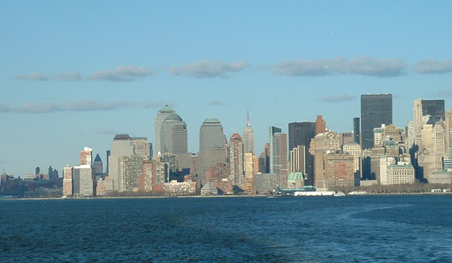 Manhattan from the water. The Empire State Building is visible in the center of the skyline.