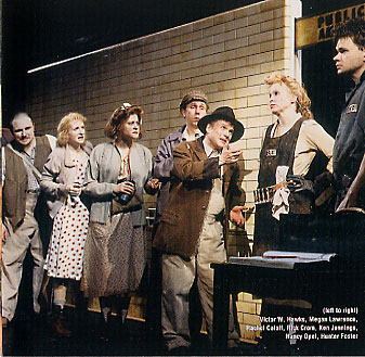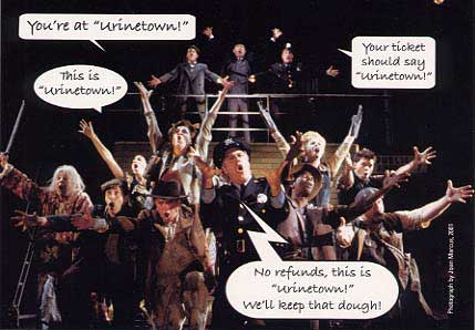 not having a clue what the show was about. Something about, "in Urinetown you gotta pay to pee." As we worked our way inside it became evident this was something different. Imagine, if you will, the Reg Lenna painted in semi-gloss black from top to bottom. We soon found our seats in the mezzanine. They were on an aisle so we had tons of leg room. Mike claimed seat D 6. The railing was there, but given the way the space was being used, it was certainly not a problem. I thought back to the Irving Plaza just the night before and was happy to be sitting down for this show. The environment was embellished with holes smashed through the ceiling allowing beams of light through to sculpt the haze that flowed around the venue. The stage was surrounded with scaffolding. Our seats being close to the wall afforded us a close-up view of the action happening on the stage left scaffolding(what would normally be the box seats). Soon a prison guard/cop worked his way into the area,doughnut in hand. Not far behind him the conductor made his entrance from stage left and crossed the stage to the "pit" a fenced-in area offstage right. Soon, we were off to Urinetown. For a sample of the music go to the Urinetown website and check it out. The show was a trip and left us with many fond memories, some of which were captured on these post cards that were free for the taking in the amenity in the lower lobby.