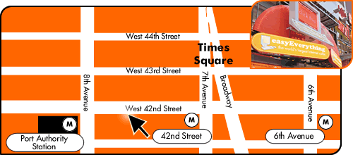 We worked up an appetite shopping, so it was on to lunch. We found a Sbarro's a block or two further north. It wasn't very crowded, but the pizza bar still had lots of choices. We also enjoyed the pizza server's Italian approach to customer service. It was the authentic version of what many Jamestown folk aspire to. This guy had an eyebrow vocabulary that left me wanting to take notes. After the brief show, we grabbed a table and caught our breath. We were still buzzing loud enough that a woman at a couple tables away asked us to review "the score". I was happy to ablige. Afer lunch we headed back down to 42nd to make one last try at finding the internet cafe. We did. It's called easyEverything's Easy Internet Cafe. It was huge.