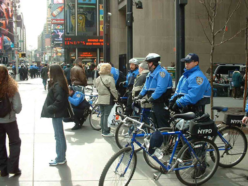 "Yes, they're center mezzanine. Enjoy!", I heard as we walked away from the window. I was still completely stunned as we walked back onto the street. I wanted to high five somebody, but I resisted the urge until I made a goodbye to a linemate and we were well clear of the line. "Holy Shit!", Mike put it so well, again. We weebled back to Times Square totally jazzed. Times Square now had it's own strange reality. Out of the shade and able to warm up in the bright sunshine we were still in shock as we wandered through the crowd. The police were still out in force and now completely bored to the point of wearing goofy gimmicks like eye glasses with moustaches, Jerry Lewis teeth and the like. Others that were less inventive offered to take pictures for tourists as you can sort of see in this photo. The cop on one knee is taking a snappy for the two girls.