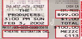 I didn't do a very good job of setting the CD player to go off at 8:00 singing "Run Freedon Run." We woke up on our own a little after 9. We were pretty much in a slow motion, Urinetown stupor. Once we both had a chance to shower we formulated a game plan for our last day in The City. First we would pack and check our bags with the concierge since we had to check out of the hotel by noon. It took us until 10 or so to get our stuff together. Our next step was to plan the day. We figured we would head down towards Times Square, find some breakfast, hit the online cafe and after finding out curtain and departure times, head for the St. James cancellations line to see if we could score tickets to The Producers. If we didn't score, we'd come up with a Plan B. The concierge had our bags and we were checked out of The Ameritania by 10:15. Once again we found ourselves walking down Broadway towards Times Square. We ambled along in no real hurry. We knew there was an internet cafe somewhere near Times Square, so we kept heading south, figuring we would run into it. Well, we got past 45th and decided as long as we were this far down we would take a look down 44th to see if there was any action at the St. James. From Broadway we could see there was A LINE ALREADY! It was only 10:45a.m. We picked up the pace unconciously as we marched toward the theater. We discovered upon our arrival that there were already 18 people on line in front of us! We immediately got on line and waited in the shade as the cool wind burned our faces. I was a bit under dressed for a long wait, but Mike was free to retrieve some breakfast goodies. It wasn't long before we had some hot bevs and a muffin to share. It wasn't long, too, before the line manager showed up to tell us how things were going to go during our wait. I must say the line management was extremely professional. As the line manager took everyone's name in order, we were told that there would be two choices when the box office opened at noon; 1. we could buy the ticket we were offered(everyone in the line was allowed to buy two) or, 2. we could wait until all the cancellations were sold and then purchase one of the eighteen standing room positions in the rear of the theater for $30. Mike soon calculated we were #'s 28 and 29 in line. I told the line guy when he asked, without sounding too pitiful, that we would take ANYTHING. Mike then asked him what the odds were of getting in. We were given a wavy-hand, maybe-yes, maybe-no-look with a courteous smile. The line guy moved on to the next folks in line. It then became one of those typical New York waiting-in-line experiences, people offering to hold spots for you while you made a pit stop or went for more coffee, gradual introductions, and lots of smiles while waiting in the wind hoping to get lucky. As promised, the line began to move at noon, if only from the gentle squezze of anticipation as eveyone urged the line forward. The two ladies at the very front of the line who had brought their camp chairs were determined to go for the standing room bargain. They would be entrenched until the cancellations were done, but not before getting well wishes from the rest of the line. The first lucky cancellation reapers were through the door to the box office at 12:15. Mike and I reviewed our strategy for the 6 or 7th time. Okay, it's Super Bowl Sunday. What fool is going to drive in from Connecticut today to see this matinee? Nathan Lane is out today. Hell, he's probably at the Super Bowl, anyway. Matthew Broderick is in, and he's who we really want to see. After strategy review number 8, 9 and 10, the line had barely moved. About 20 minutes later, the morning coffee must have kicked in at the box office. Things felt like they were moving a little faster. Maybe it was the fact the sun had warmed things up a bit. At any rate, at 12:45 we found ourselves at the front of the cancellations line. We started giggling like little schools kids, smiling back at the folks behind us in line like we were about to have our pictures taken with Santa Claus. I was secretly hoping for seats in the rear orchestra, at least not, please, in the rear corner of the balcony. The line manager soon emerged from inside with clipboard in hand. He strolled up to us and said, "I have third row mezzanine, face value $100 each. Or, you can wait for standing room." Mike and I looked at each other, completely speechless. I looked to the folks standing behind us to see if they had heard the same thing we did for confirmation. "We'll take 'em", was all I could muster. We got to the window and pulled out the cash(which, buy the way, is all they will accept at the cancellations window). I still couldn't believe my eyes as I held my ticket in my hand.