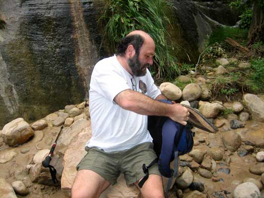 Before sacking out we had decided on making The Narrows the focus of our Wednesday. I had set my travel alarm for 8am and wasn't too happy when it started chirping. Mike was still snoring as I headed for the bathroom, being the first to discover the guy at the front desk wasn't kidding about the power going off. I used my Mini-Mag to see to brush my teeth. Mike was soon hip to the news and showering by flashlight a few minutes later. As I gathered my stuff together for a day of slogging, Mike moved to the balcony office to have an actual phone conversation with the HR department. The real world had finally arrived for Mike. Well, arriving in less than two weeks, anyway. We headed off to town to find breakfast in a place with lights. We thought the power outage was going to be confined to just the hotel. However, the utility pole in need of maintenance was actually feeding the whole town. We had to drive up to the Pioneer Lodge to find a coffee shop that had a generator. It turned out to be a great find. Knowing we had a day full of slogging ahead of us, we took our time to have a big breakfast( secretly hoping the river water would warm up a bit). I was quite impressed with the coffee. I've had a few better cups, but it's the best house coffee, by cup or the pot, I've ever had, no question! We finished our meal and then walked a few doors down to the Zion Adventure Co. to rent some canyoneering shoes. I have done The Narrows before and discovered there are two ways NOT to do the hike; barefoot, or with a pair of shoes you plan to throw away. Either way, you're slogging slowly or you're trashing your feet, probably both. We opted to spent $17 each for some support and traction. Mike also liked the walking stick. We were running a little late getting there and caught a bit of "schooling" from the staffer there, but the briefing was helpful and we got on our way feeling our rental gear would help us make up some lost time. It was a bit cloudy(who needs about sunshine in a narrow canyon?) and the chance of rain was slight. We were going to have a sloggy day! We drove up to the Visitor Center and hustled to the canyon tram. The jaunt down the Riverwalk went quickly and we were soon taking advantage of a few flat boulders to swap footwear.