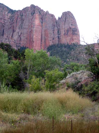 When hastily planning our trip we figured we would head back to Vegas on Thursday evening in order to make our mid-day flight on Friday. What a waste that would have been! It was a pleasant surprise to learn(again, for me) that we crossed a time zone at the Utah border. The extra hour to get to the airport on Friday morning was just enough to get us to change our itinerary. With another full day to hike we decided to go for Kolob Arch. We got an "early" start for the Kolob Canyon section of the park since it was easily 45 minutes away. It meant driving back to LaVerkin and then heading north. We stopped by the grocery store at the traffic light to pick up some snackies. There was also a coffee shack in the parking lot that made a mean cup of whatever you needed to wake up. Two cups to go and we were at the Kolob Canyon Visitor Center by 9:00 to check in. The ranger gave us an update on the weather and asked a couple of questions to make sure we knew we were good to go. We re-checked our pack at the Lee Pass trailhead on Kolob Canyon Road about 10min later. It was cloudy and a bit windy, a chance of thunderstorms and, fortunately, pleasantly cool. Considering we were going to do a 14 mile R/T with a fair amount of altitude change we didn't mind the conditions. The hike to The Arch is somewhat the opposite of Angels Landing. One starts off with a decent of about 1000'+ over the first mile or so. Compared to Angels, this is fairly gentle as you wind through trees and up and down dry washes. The red soil and rocks compliment the greens of the junipers and other trees. We followed Timber Creek as Kolob Canyon Road disappeared behind and over our right shoulders. Unfortunately, we didn't stop to take photos on the way in, mindful of the length of the hike we were taking.