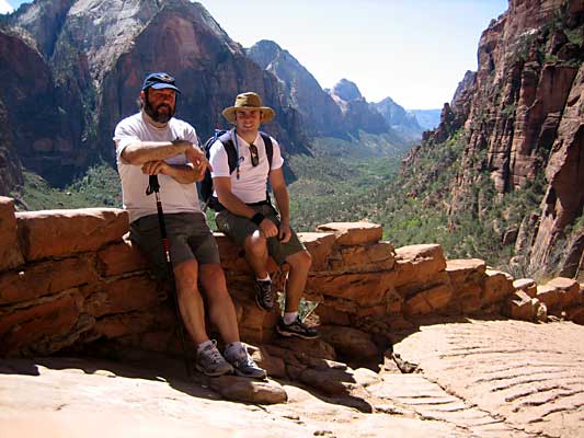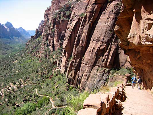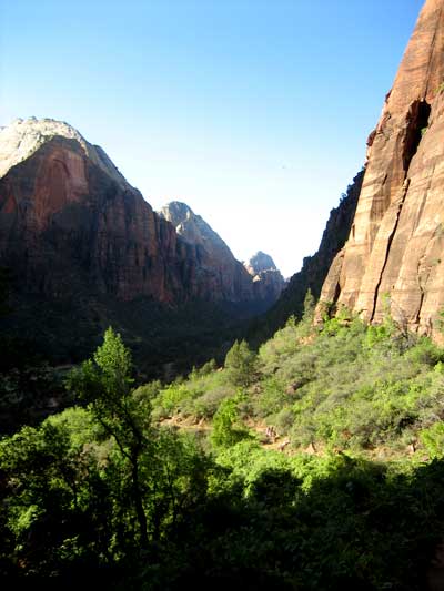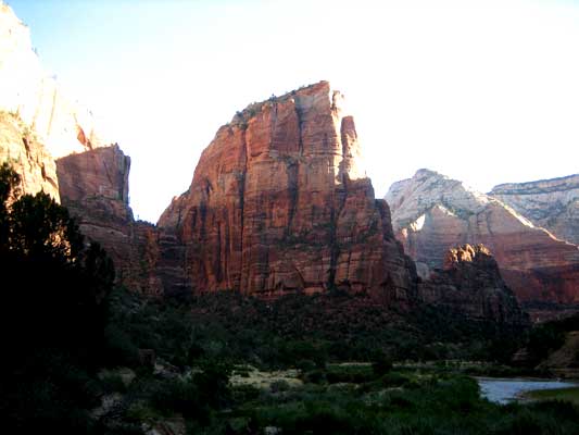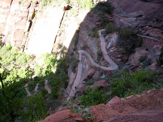 My cell phone rang at 6:15am. I was expecting the call on my cell, but I had planned not to answer it. Unfortunately, my reflexes kicked in and I grabbed the call. It was my dental hygenist calling to encourage me to show up for my 2pm appointment regardless of the fact I had left a message saying I wasn't going to make it. I don't think she believed me when I told her I was in Utah. Maybe she thought that was a part of southern Chautauqua County she hadn't visited, yet. Anyway, we were awake around 7:30 and alert shortly after that. I tried making a cup of coffee with the with the maker in the loo, but that was a mistake not to be repeated having been spoiled by the previous day's set-up in the Candlewood room. Breakfast would have to be from a convenience store. We stopped for some goodies at the Canyon Tire Food Mart(it's for sale, by the way) and were soon on our way up-canyon to Angels Landing.