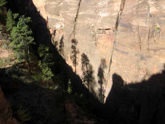 The walk through Refrigerator Canyon is for the most part unremarkable. It's just a series of moderate switchbacks that on a hot day it can offer welcome shade for hikers in both directions. However, it does make for an interesting backdrop when looking down from above. Mike caught a snappie of these shadows on the canyon wall.