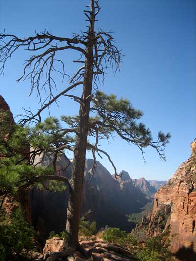 The next stop, and what feels like halfway to me, is Walter's Wiggles, a series of small, steep switchbacks that really get your thighs pumping. I don't have any images handy from my previous trips, but the two links below have some really sweet ones. Steve Bern's is the coolest(click on the link below). As you look at his image, Refrigerator Canyon is in the lower part, the trail entering from the right. Walter's Wiggles is at the bottom center. Angels Landing is at the top of the sheer cliff face that is in shadow(not the very top of Steve's image). The next link shows The Wiggles from above. http://www.cs.wisc.edu/~wenger/images/zion_vegas/walters_wiggles.html